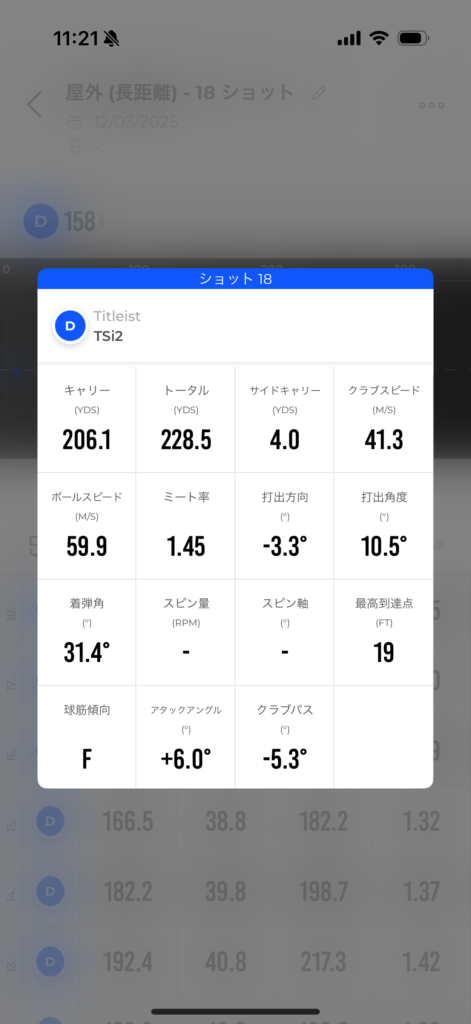 トップトレーサー・レンジではトータルで271ヤード(ボール補正あり)、キャリーで245ヤード、ボール初速68m/s、打ち出し角17度で、SPECTRUMではキャリーで216.9ヤード、ボール初速66.6m/s、打ち出し角15.7度、右に0.2度と出ました。おそらくSPECTRUMはレンジボール補正はしていないのだと思います。あと、SPECTRUMはボールの曲がりはシミュレーションしていないのかもしれません。スライスとかフックはしない感じでした。トップトレーサー・レンジのドラコンモードはドロー系でないとランが出ないので、実際は苦手なドローボールを打っています。