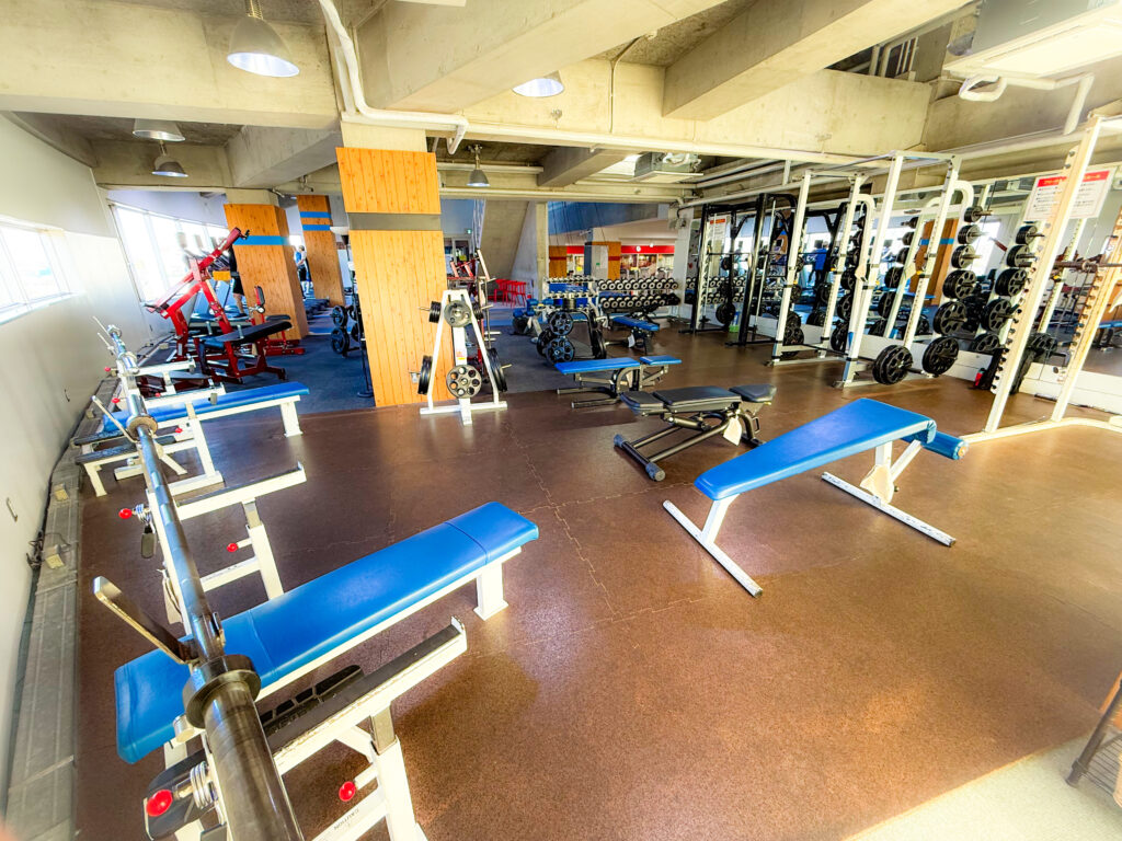 平日午後でしたので年配の方が多く、フリーウエイトエリアはほぼ貸し切り状態でした!