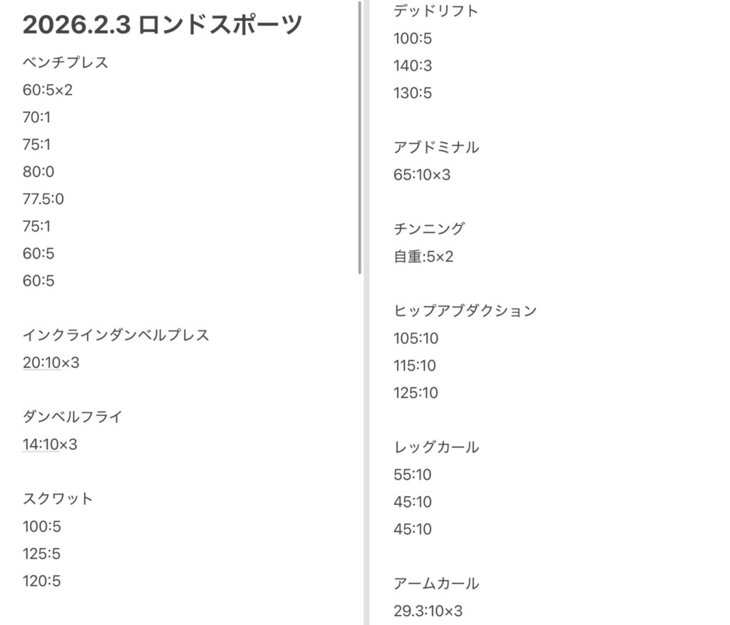 あらためて、ゆっくりとジムを利用させてもらいました。2026年2月3日時点でのMAX重量でBIG3をやっておきました。