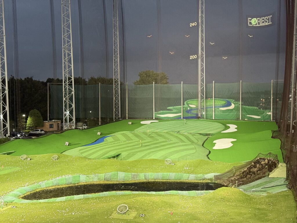 3階打席からの眺めです。よく見ると本物の池に小さな滝のようなものがあります。また、正面ネットにフェアウェイの延長イメージが描かれていて、奥行きがあるように感じます。