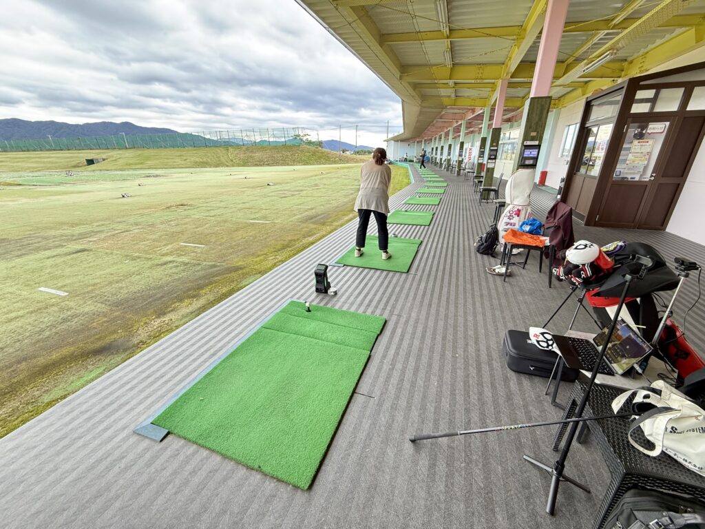 私が知っている練習場の中では唯一打席仕切り板がない練習場が、新潟県村上市の+Catゴルフ練習場で、このように余裕で設置ができます。もともと打席間隔も広いので、前の打席の人に踏まれることもまずないでしょう。