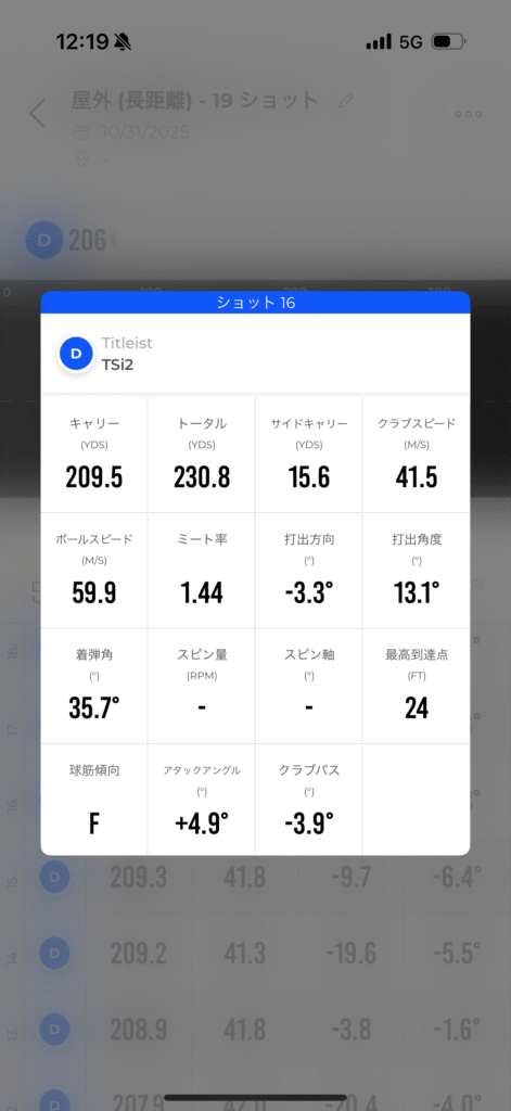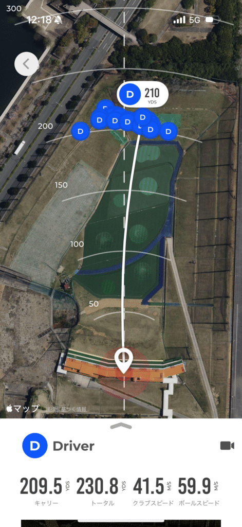 普通に飛ぶレンジボールだと思います。ちなみに、RapsodoMLM2Proではこのショットよりトータルで飛んでいるショットが2球あるのですが、トップトレーサー・レンジはあまりボールを高く上げない方がランが伸びる傾向なので、このショットがベストでした。以前はドロー系のボールでないとランが伸びなかったのですが、トップトレーサー・レンジのアルゴリズムも進化しているそうで、大分前からフェード系のボールでもランが伸びるようになりました。