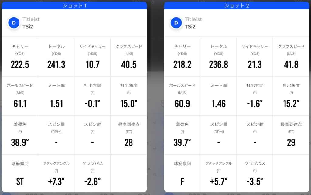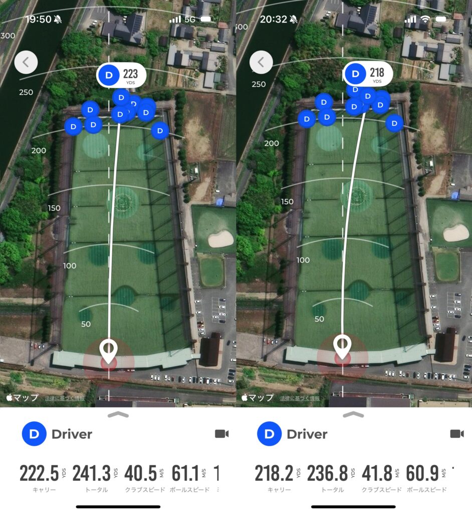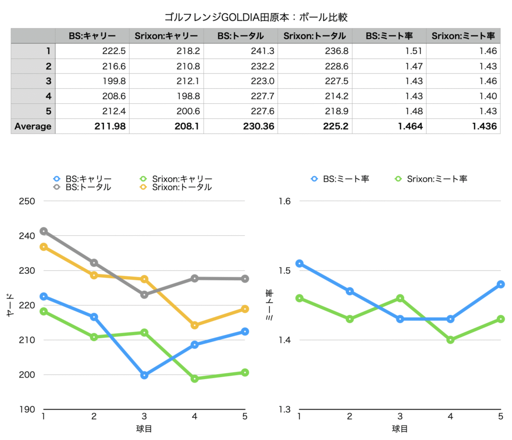 私のショット精度では厳密な比較には全く適していませんし、夜なのでRapsodoMLM2Proの測定精度も微妙かもしれませんが、照明が明るかったので大丈夫だと思います。数値としてはややブリジストンの方がよく飛び、ミート率もブリジストンの方が少し良い結果でした。自分で打った感じでもブリジストンの方が飛んだ感じがありました。スリクソンの方はよりソフトな打感でした。