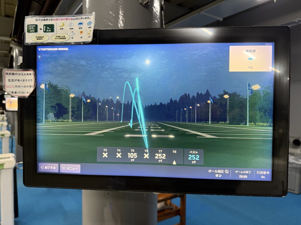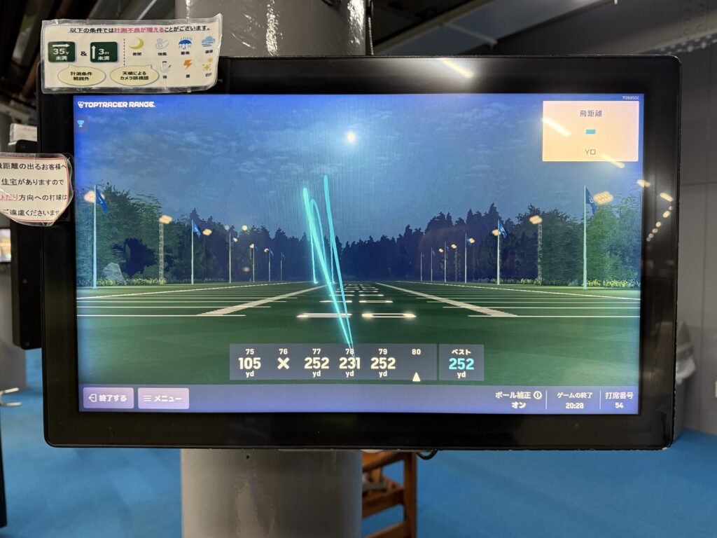 打席ではトップトレーサー・レンジが利用できます。とりあえずこの日は翌日のコンペでどちらのドライバーを使うかを決めるために、ドライバーマン振り比較を・・・