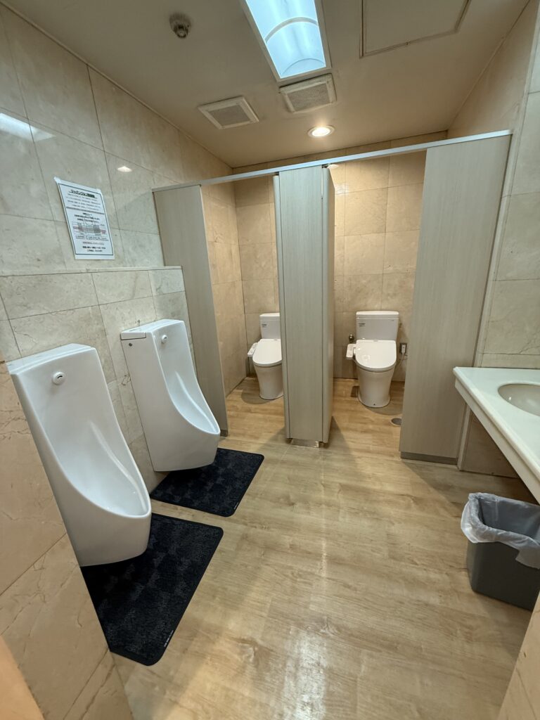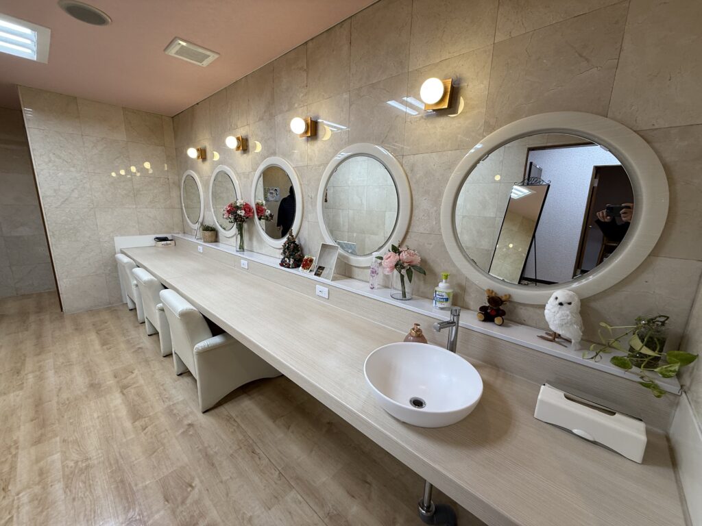 許可をいただき、女子トイレのパウダーエリアを見せてもらいました。男子トイレにもありますが、女子トイレの方が断然広くなっています。更衣室やシャワーもあります。